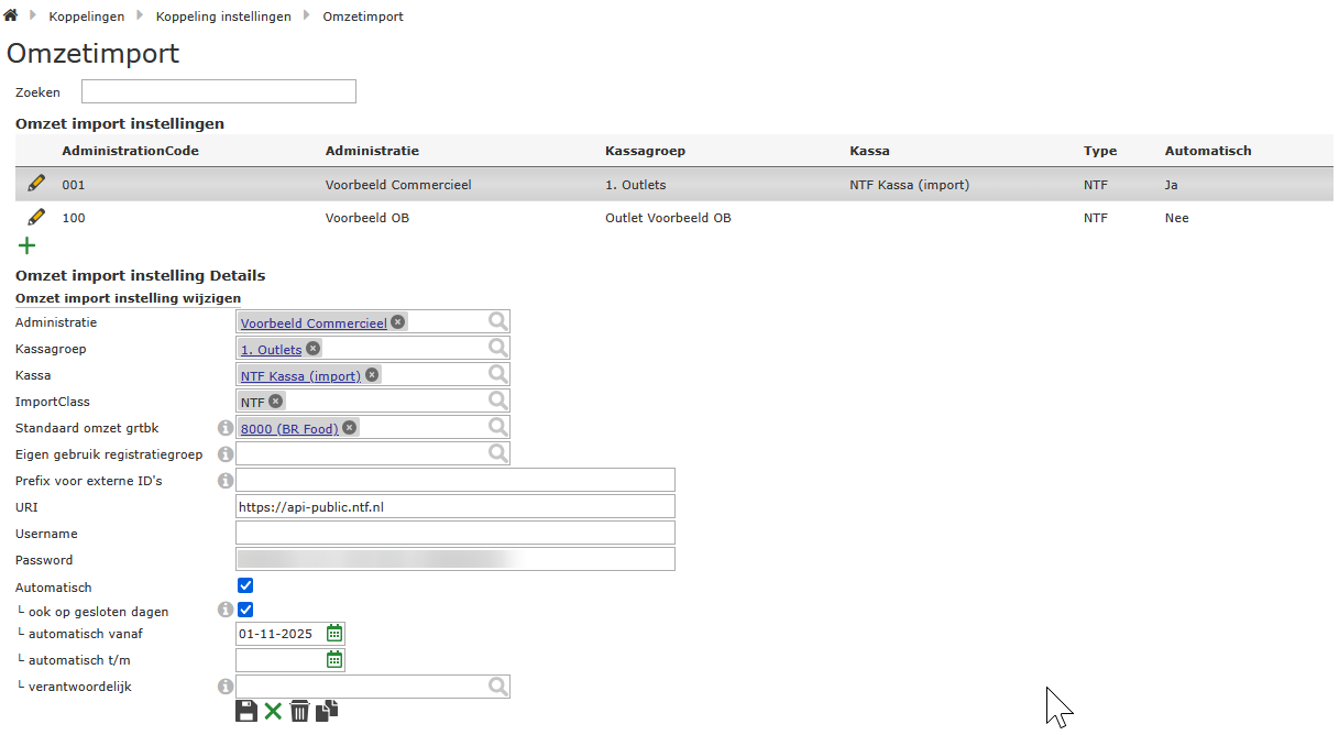 Per administratie heb je een Omzetimport-instelling nodig. Je mapt de Administratie en Kassagroep, en ImportClass zet je op “NTF”. Uit de eerder verzamelde gegevens stel het URI en Password in. Als je al een bestaande instelling hebt, dupliceer deze dan voor het gemak. Map dan wel opnieuw de Administratie en Kassagroep.