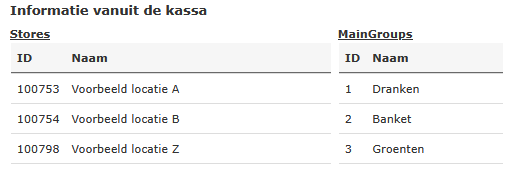 Onderaan de pagina worden twee tabellen zichtbaar, Stores en RevenueGroups. Dit zijn de actuele gegevens uit de API van NTF en heb je nodig om de kassa in Staff het correcte ExternId te geven.