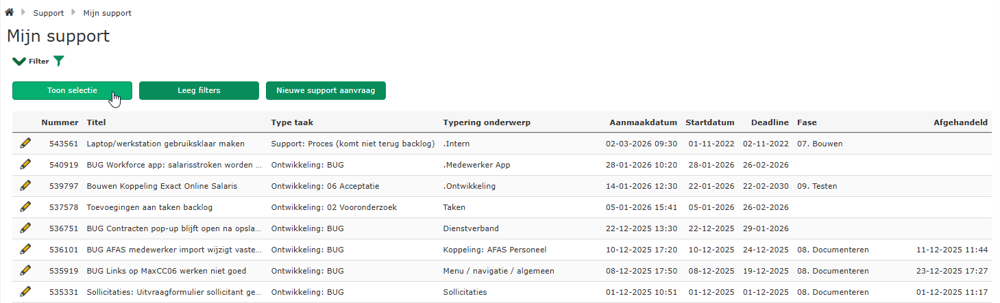 Ga naar pagina Mijn support en klik op de knop “Toon selectie”. De tabel met openstaande supporttaken komt in beeld.