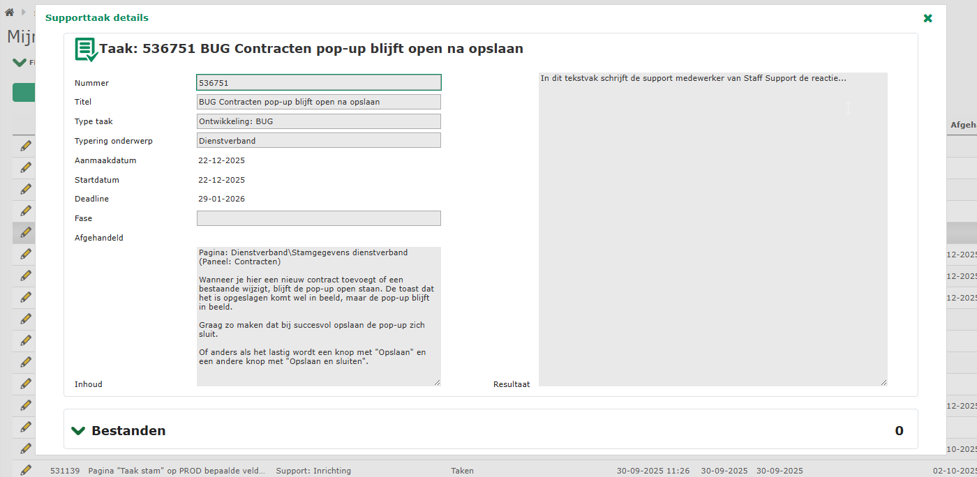 Om details van de supporttaak in te zien, klik je het simpelweg aan in de tabel. De pop-up met details en bijlagen komt in beeld.