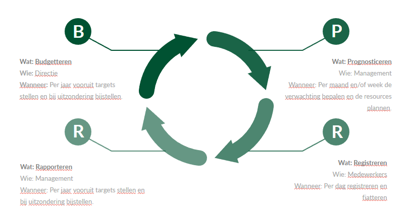 Budgetteren, Prognosticeren, Registreren en Rapporteren.
