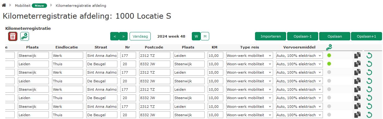 Toegevoegd aan de pagina Kilometerregistratie medewerker en Kilometerregistratie afdeling zijn de knop “Registraties declareren” en de statuskolom “Declaratie aangemaakt”. Deze functionaliteit is toegevoegd om snel van de registraties een declaratie aan te maken. In de statuskolom zie je in één oogopslag van welke registraties dit al gebeurd is (groen bolletje) en welke nog open staan (grijs bolletje).