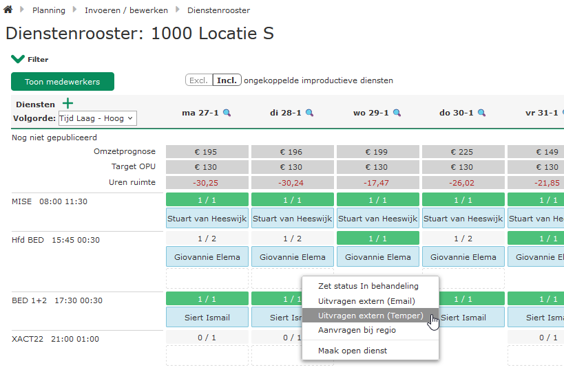 Toegevoegd aan het Dienstenrooster is de mogelijkheid om direct een dienst bij een extern platform (zoals Temper) uit te vragen. Dat betekent dat de planner van de afdeling zonder tussenkomst van de regioplanner een dienst op het platform van Temper kan aanbieden.