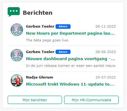 Toegevoegd aan de Medewerkerkaart is het paneel Berichten. Hierin ziet de medewerker zijn laatste drie berichten en kan deze meteen vanaf dit paneel openen. Ook bevat het de link naar Mijn berichten waar alle nieuwsberichten voor de medewerker te zien zijn. En ook bevat het de link naar Mijn HR-Communicatie waarmee er een bericht aan HR gestuurd kan worden.